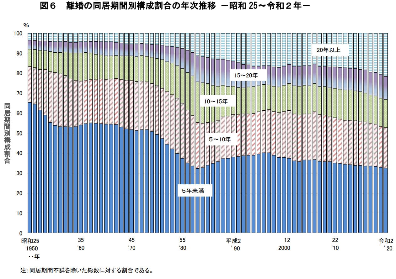 厚生労働省の統計によると、離婚時点で同居期間が「20年以上」の人は、令和2年時点で21.5%にも達しています。